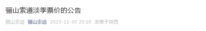 骊山索道自2023年12月1日至2024年2月29日执行淡季票价。具体如下: