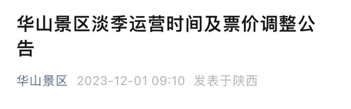 华山景区自2023年12月1日零时至2024年2月29日执行淡季门票价格及运行时间。具体调整如下: