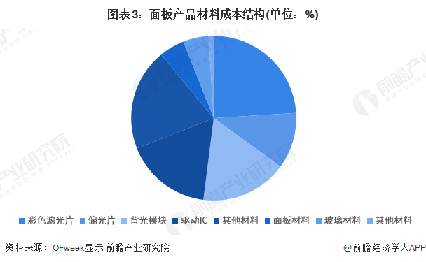 根据OFweek显示的数据,面板产品的材料成本中彩色滤光片占24%,偏光片占11%、背光模块占17%、驱动IC占17%,这四项占比较大,是面板产品主要的成本构成。