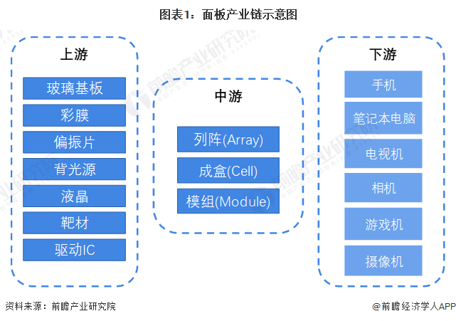 面板产业的上游以洛玻为代表的玻璃基板供应商、纬达光电等偏振片提供商、东旭光电等彩膜提供商、隆利科技等背光光源提供商、江丰电子等靶材提供商。中游作为面板行业主体,主要进行面板与显示模组制造。下游为3C电子、工控等显示终端。以尺寸可分为小尺寸-手机面板,中尺寸-笔记本显示面板,大尺寸-电视机、显示器面板等。