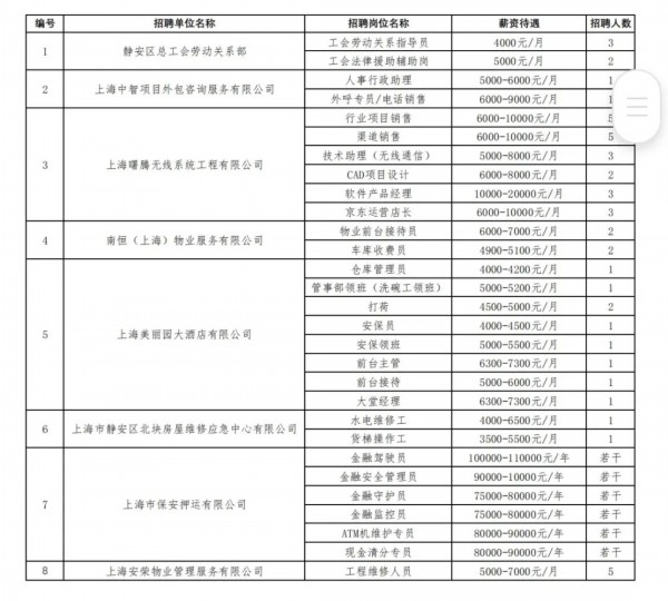 行业涵盖电商、文员、服务等,如有您心仪的工作岗位,可将个人简历发送至静安区总工会职工援助服务中心邮箱: