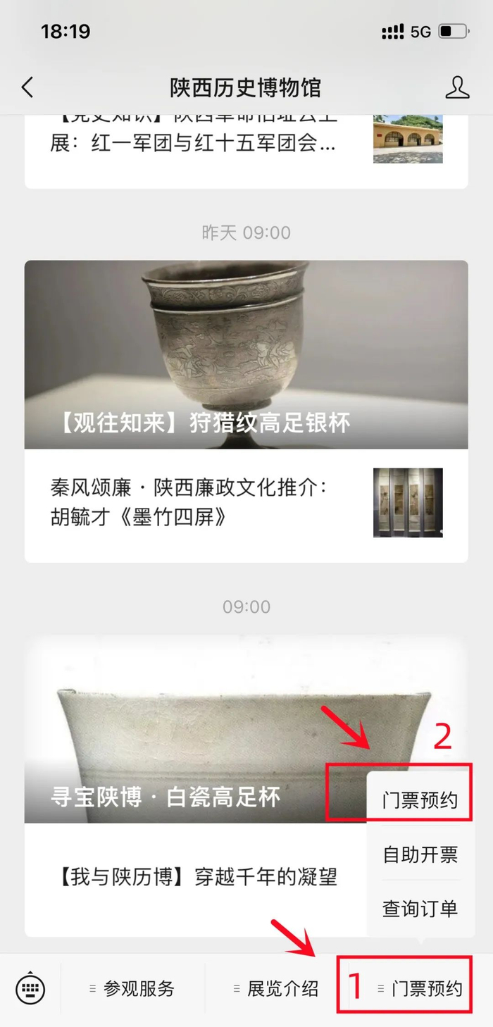 微信公众号预约请点击右下角“门票预约”(标记1处),然后继续点击“门票预约”(标记2处)选项。