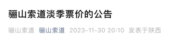 骊山索道自2023年12月1日至2024年2月29日执行淡季票价。具体如下: