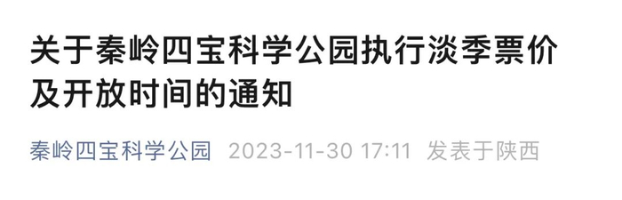 自2023年12月1日起,秦岭四宝科学公园开始执行淡季票价及开放时间。现将具体事宜通知如下: