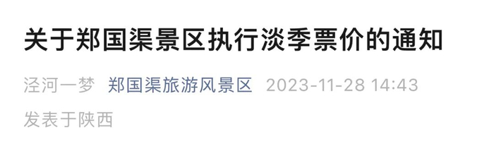 自2023年12月1日至次年2月底(节假日除外),郑国渠景区门票执行淡季价格:门票60元/人,成人现特惠50元/人。景区往返交通车30元/人。