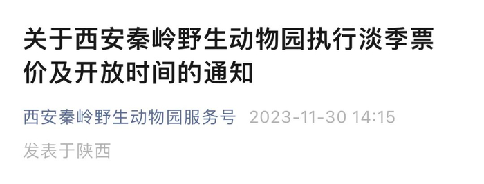 自2023年12月1日起,西安秦岭野生动物园开始执行淡季票价及开放时间。现将具体事宜通知如下: