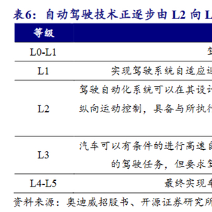 开源证券诸海滨等10月18日研报指出,根据工信部《汽车驾驶自动化分级》,自动驾驶与高级辅助驾驶通常按照等级分为L0-L5六个级别。自动驾驶技术正逐步由L2向L3、L4级迈进,各大车企正加速对L3级以上自动驾驶的布局。据悉,L3级别的智能驾驶系统被认为辅助驾驶与自动驾驶的分水岭,L3级别之后,驾驶的主导权逐渐从驾驶员转移至自动驾驶系统。