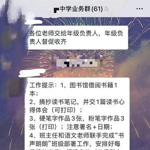 学校规定教学任务留影像记录。于是每天早自习,老师们要把学生的早读情况拍下来,年级负责人也要记录每天的教学情况,一起发到教师管理群。群里的消息刷屏太快,以至于秦梓峰后来屏蔽了这个群。