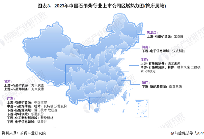 从区域分布情况来看,石墨烯上市公司主要分布在广东地区,且广东地区石墨烯产业链布局相对完善。具体来看,上游石墨矿资源和石墨烯制备相关企业分布在甘肃、黑龙江、江苏和广东地区;中游石墨烯薄膜/粉体相关企业主要分布在江苏、广东地区;下游应用领域广泛,主要分布在以广东为代表的地区。
