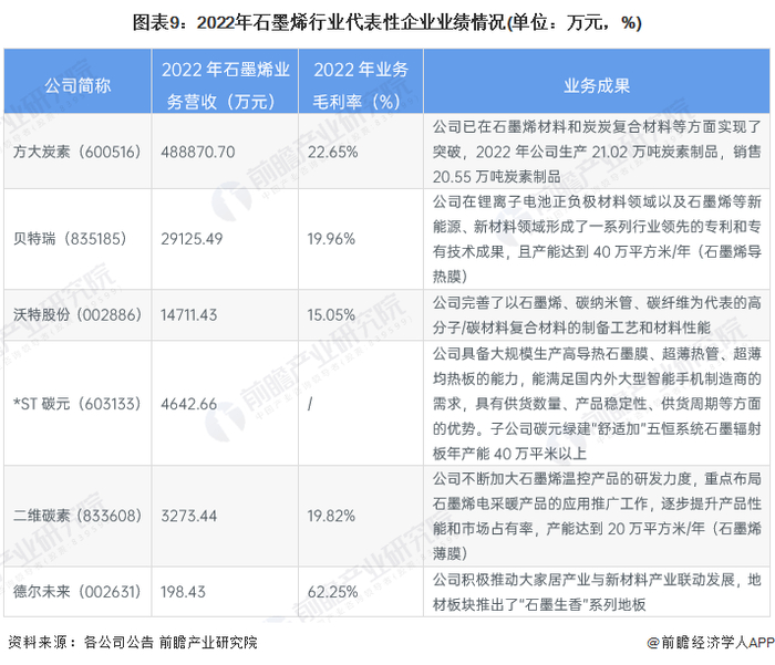 国内石墨烯企业以中小企业为主。领先上市企业包括贝特瑞、方大炭素、银基烯碳、沃特股份等,各个企业石墨烯业务布局各有侧重。2022年,贝特瑞和方大炭素作为石墨烯行业中的龙头企业,石墨烯业务营收分别为2.91亿元和48.89亿元。各公司的主要业务业绩情况如下所示: