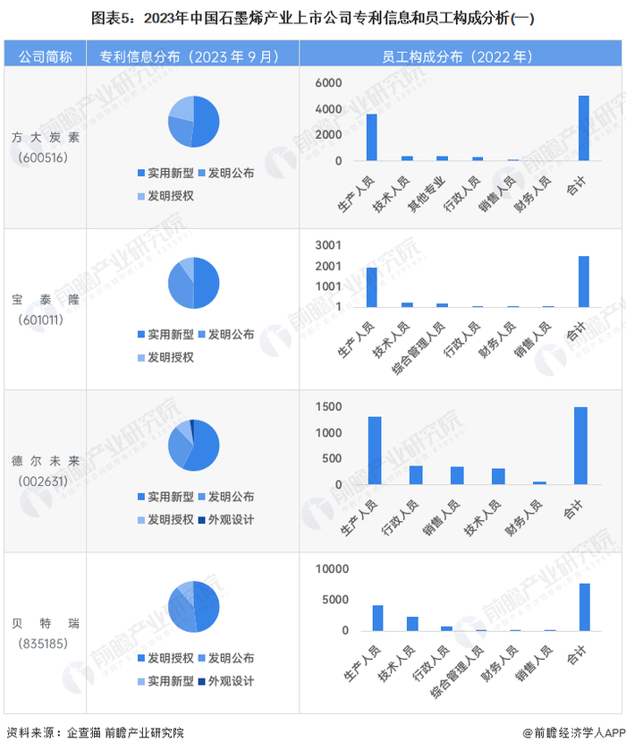 从石墨烯行业的上市企业已有的公开信息分析,石墨烯行业上中游企业规模相比于下游应用领域较小。其中石墨烯领域专利信息相对较多的企业是贝特瑞,专利数量超过300条;员工总数较多的企业为贝特瑞和方大炭素,员工总数超过5000人。