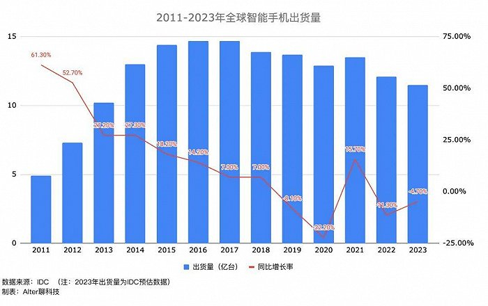 (注:2023年出货量为IDC预估数据)尽管不同调研机构的口径有所不同,但普遍认为出货量巅峰在2017年前后,之后市场开始进入下行周期。因为5G等新技术的出现,全球智能手机出货量在2021年短暂复苏,却未能持续太长时间。按照IDC的统计报告,2022年全球智能手机出货量同比下降11.3%,预计2023年的出货量比2022年减少4.7%,将创造10年以来的销量新低。