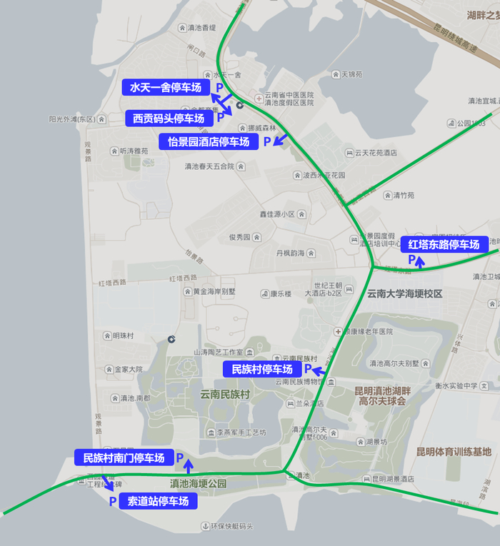 同时,为进一步方便游客停车,昆明公安交警对海埂大坝片区外围停车场进行了梳理,自驾的游客朋友可以选择将车辆停放在区域外围的水天一舍停车场、西贡码头停车场、怡景园酒店停车场、红塔东路停车场、民族村停车场、民族村南门停车场、索道站停车场等停车场,然后搭乘停车场周边的专线公交或步行进入海埂大坝区域。