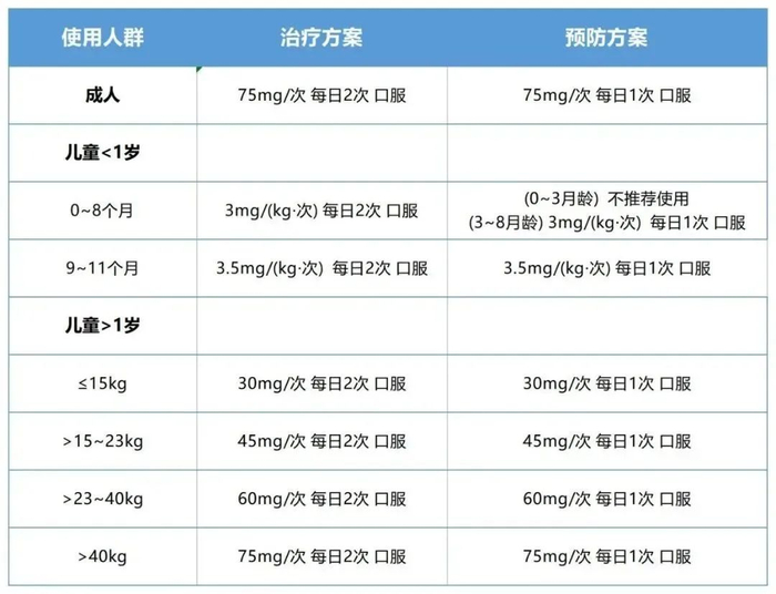 不同年龄人群奥司他韦治疗及预防适用剂量。