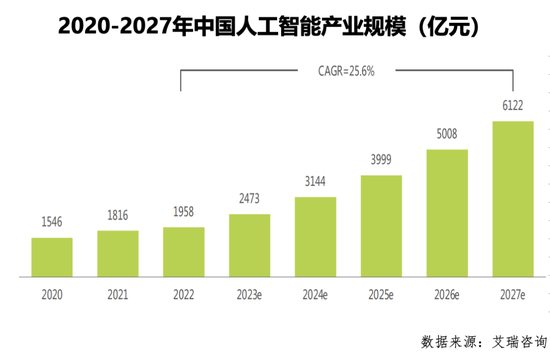 据艾瑞咨询数据,2022年中国人工智能产业规模达1958亿元,年增长率7.8%。目前,中国大型企业基本都已在持续规划投入实施人工智能项目,未来随着中小型企业的普遍尝试和大型企业的稳健部署,在AI成为数字经济时代核心生产力的背景下,AI芯片、自动驾驶及车联网视觉解决方案、智能机器人、智能制造、决策智能应用等细分领域增长强劲。2027年人工智能产业整体规模可达6122亿元,2022-2027年复合增长率达25.6%。