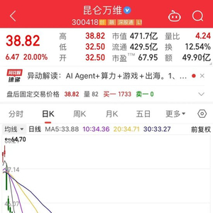 “老妖股”昆仑万维20cm涨停