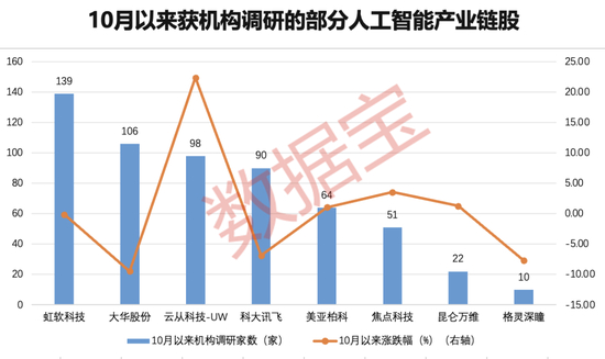 证券时报·数据宝统计显示,上述产业链个股中,寒武纪-U、昆仑万维等22股,今年以来自最低点的最大涨幅超100%,自最高点的最大跌幅超三成,均超过同期人工智能指数的最大跌幅;其中虹软科技、大华股份、云从科技-UW、科大讯飞等8股10月以来获10家及以上机构调研。