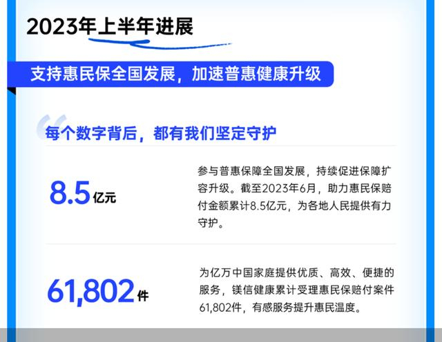 今年7月,镁信健康在其官方公众号上发布2023半年报,普惠健康就是第一个被详细提及的数据。数据显示,截至2023年6月,镁信健康助力惠民保赔付金额累计8.5亿元。在高值特药方面,扩容各地特药保障药品清单,覆盖药品种类数量占全国项目总数90%以上。