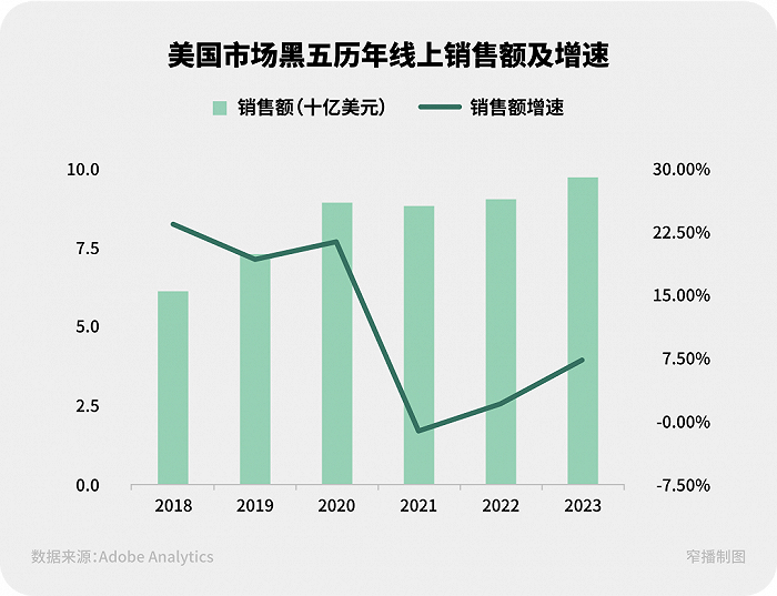 美国市场,全年最重要的大促节点之一黑色星期五也刚刚落幕。据电商研究机构Adobe Analytics的数据显示,今年黑五美国市场的线上消费总额同样超过预期,达到98亿美元的新高,较2022年同比增长7.5%,已经是后疫情时期的最高增速。