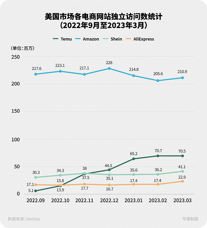 另一则来自SimilarWeb的数据显示,在美国市场的线上成交转化率方面,2023年9月,Temu转化率为4.6%,Shein为4.7%,Amazon则高居11.8%;到了大促预热的10月份,Temu转化率4.5%,Shein 4.1%,Amazon已经到了恐怖的56%。