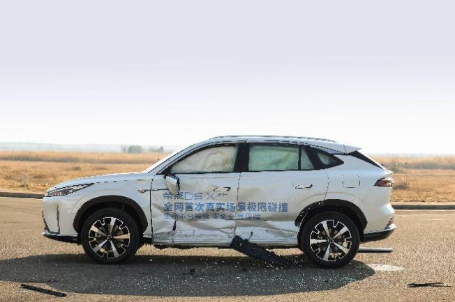 此类碰撞测试也重点考核了测试车辆电池包安全防护的能力。测试中,车辆遭到猛烈碰撞后,高压系统显示自动断电,电解液也无泄漏现象,电池包未起火、未爆炸、未冒烟。这得益于荣威D5X以高强度框架设计对电池进行整车全方位强劲防护,不仅使动力电池可以承担10吨以上的挤压力,即使在最严苛的360度碰撞工况,电芯也能实现零损伤。