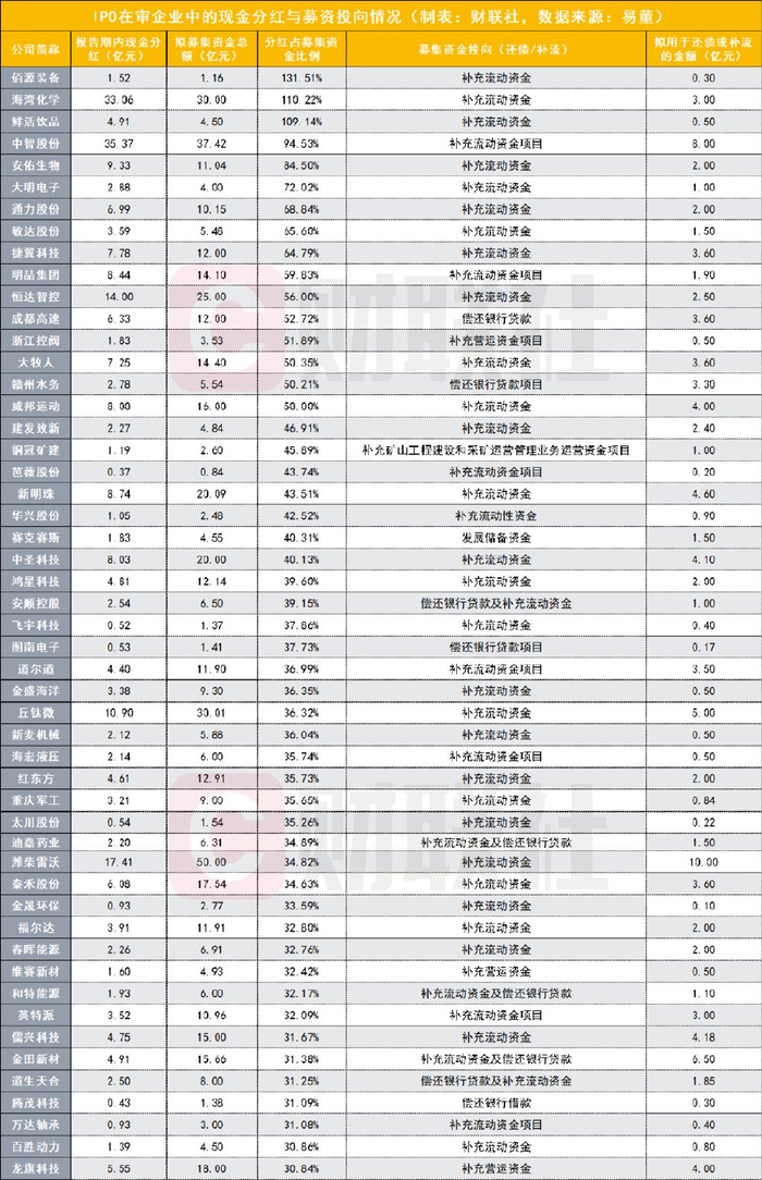 其中,佰源装备、海湾化学、鲜活饮品在报告期内的分红额甚至超过了拟募集的资金总额,分别是131.51%、110.22%、109.14%。