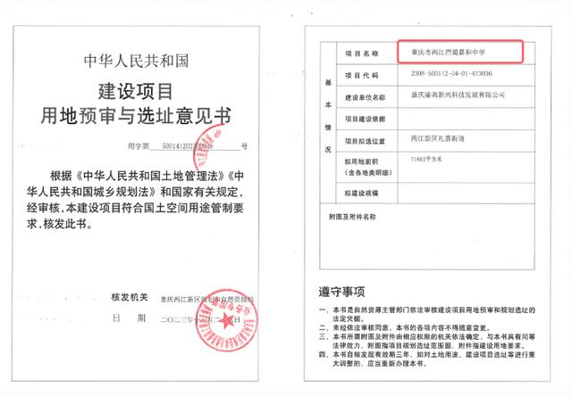11月29日,笔者获悉,重庆两江新区规划和自然资源局已经批复关于“两江巴蜀嘉和小学、两江巴蜀嘉和中学”两所学校的建设项目用地预审与选址意见书。意见书的附件对总体规划条件、地块规划条件等进行了说明。