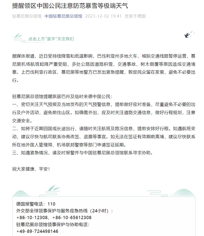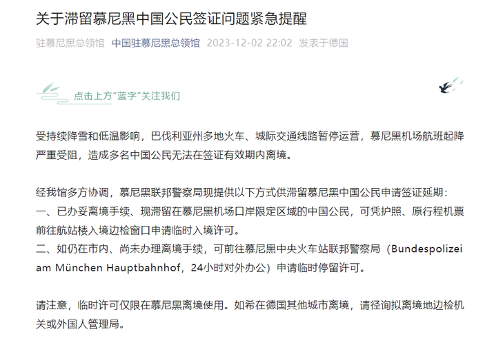 2日当天,中国驻慕尼黑总领馆还发布关于滞留慕尼黑中国公民签证问题紧急提醒称,受持续降雪和低温影响,巴伐利亚州多地火车、城际交通线路暂停运营,慕尼黑机场航班起降严重受阻,造成多名中国公民无法在签证有效期内离境。
