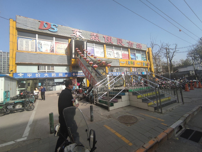 徐奶奶逛的东森便民市场,就在顺四条和宋庄路交叉口西北角。从华芳嘉园小区出来,越接近东森便民市场,小修小补商家越多。市场周边的店家最密集,修自行车、配钥匙、修手机、装修,甚至连广告图文店都打着承接家庭装修的招牌。市场里头,一层售卖生鲜,二层是各类服装加工摊位。
