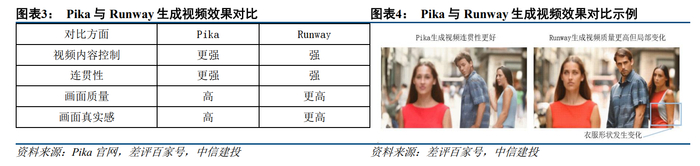 Pika连贯性、控制效果更强,Runway视频画面更好。Pika与前期知名AI视频应用Runway各有优缺点。据Pika官网,对于Pika,其能基于文本生成更为连贯自然的画面,明确视频中具体希望发生的变化,但在画面清晰度、真实性方面有待提升;Runway生成视频质量高,但部分视频可能与用户预期有背离。