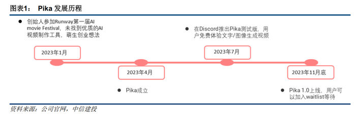 成立缘起:Pika的创始人具有哈佛大学、斯坦福大学等名校学习经历,23年初参加Runway第一届AI movie Festival时未找到优质的AI视频制作工具,因此开始创业,并于23年4月成立Pika。
