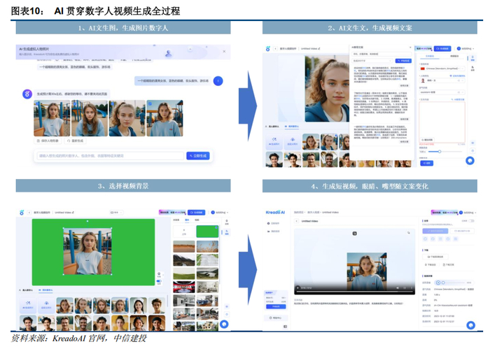 AI替代操作繁杂、耗时长的视频剪辑,短期内已广泛应用于营销、教育等对对画质、复杂度要求较低的领域,随着技术提升,长期在影视、游戏制作领域空间广阔。据易点天下,AI营销素材制作平台KreadoAI可以将视频制作效率从12小时/个缩短至6-8分钟/个,且成本只有真人的1/100。