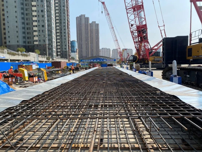 新北路站地连墙厚800毫米,共分为98个槽段,深度43.34-45.6米。施工过程中,项目团队严格把关,保证钢筋笼安全入槽,为首幅地连墙成功浇筑奠定基础,并于10月12日顺利完成吊装。