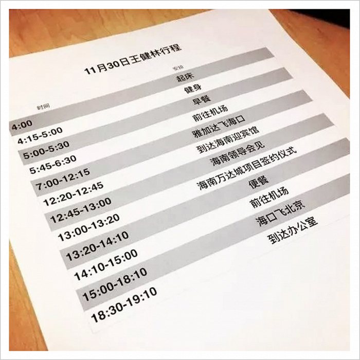 比如,访谈类节目《鲁豫有约》,曾跟拍王健林一日工作并且爆出一张行程表,日程从早上4点就被安排得紧凑且以分钟计。