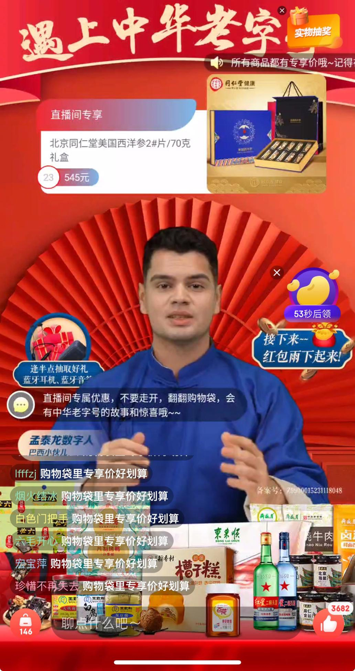 “半斤东来顺羊肉,能切出多少片?大家猜猜,评论区抠一下。”深夜,在言犀数字人小店的老字号直播专场,《最强大脑》选手、从小在北京长大的巴西小哥“孟泰龙”的数字人操着一口京腔,娓娓道来老字号的时光故事和趣闻轶事。近两日,在北京老字号协会指导下,京东云联动六必居、王致和、月盛斋、百花、全聚德、稻香村、张一元、东来顺、红星二锅头等多家北京知名老字号开展数字人直播。北京老字号协会副秘书长兼品牌促进专委会主任闫树介绍,“北京老字号已实现’九触网、七直播’”,即210余家老字号触网,近170家企业开展直播销售。