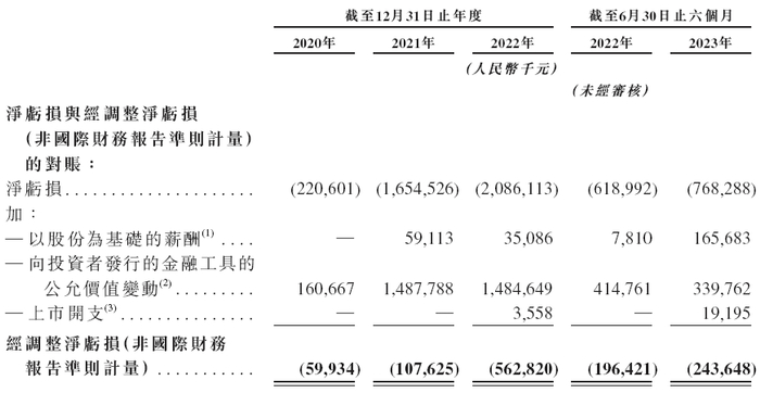 招股书显示,在过去的2020年、2021年、2022年和2023年上半年,速腾聚创的收入分别为1.71亿、3.31亿、5.30亿和3.29亿元人民币,相应期间的净亏损分别为2.21亿、16.55亿、20.86亿和7.68元人民币,相应期间的经调整净亏损分别为0.60亿、1.08亿、5.63亿和2.44亿元人民币。