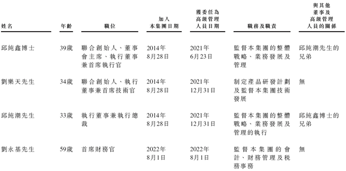 高管包括:联合创始人、董事会主席、执行董事兼首席执行官邱纯鑫博士,联合创始人、执行董事兼首席技术官刘乐天先生,执行董事兼执行总裁邱纯潮先生,首席财务官刘永基先生。