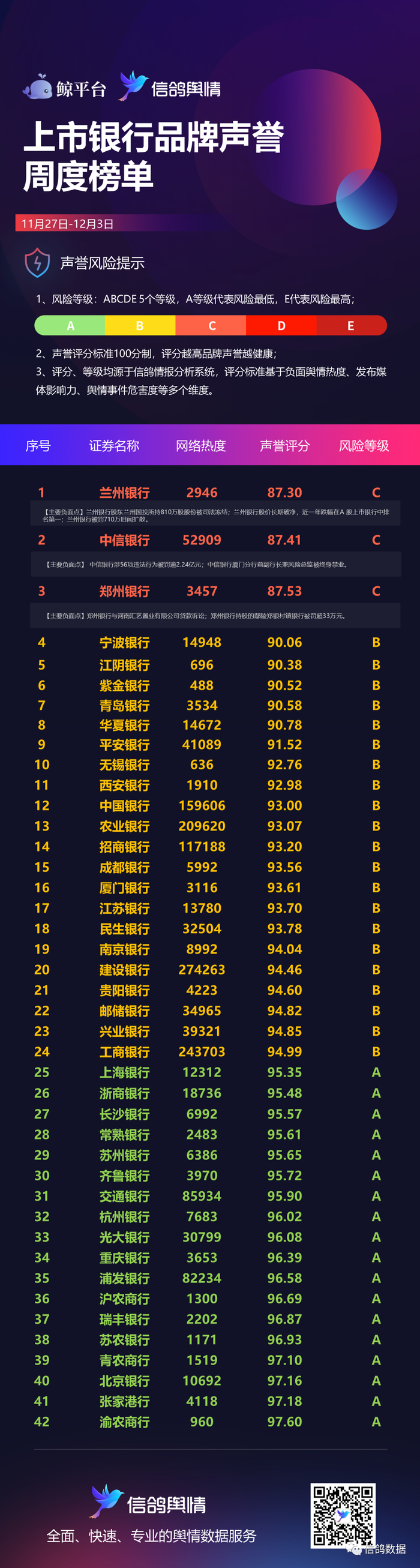 本榜单覆盖上市银行共计42家,本期统计区间11月20日—11月26日,评价模型覆盖品牌的负面舆情热度、发布媒体影响力、舆情事件危害程度等多个维度。