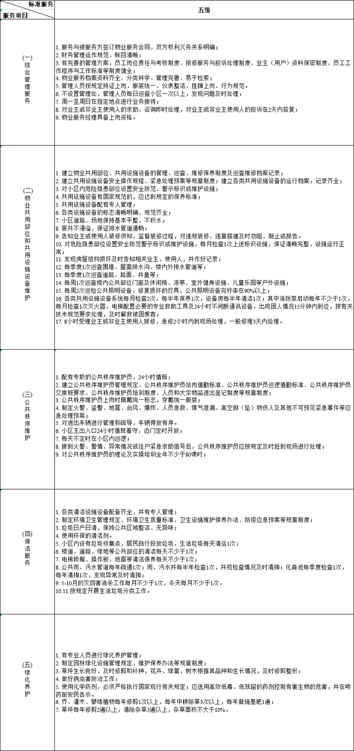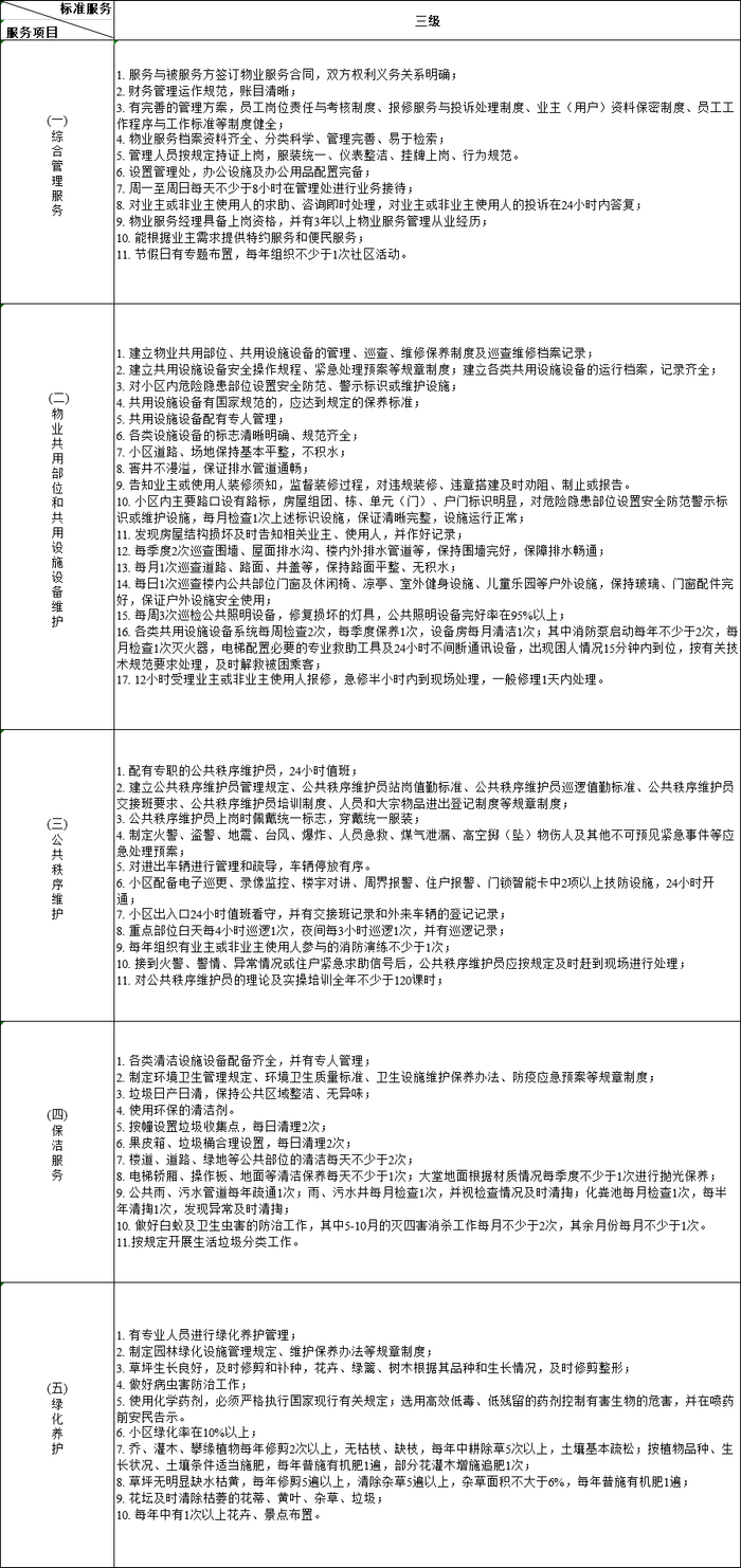 《通知》还指出,普通住宅前期物业服务项目应当包括综合管理服务、物业共用部位和共用设施设备维护、公共秩序维护、保洁服务、绿化养护等五项。