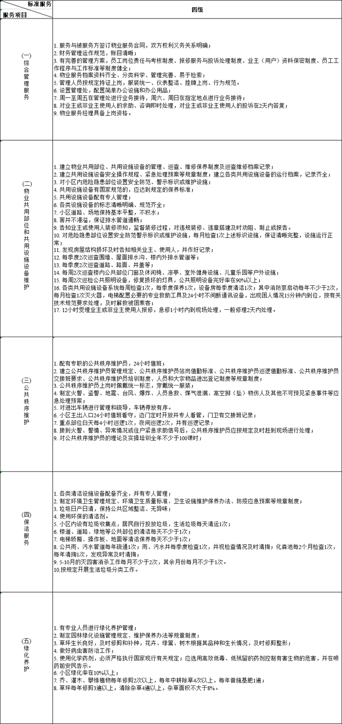 标准详情参见《广州市普通住宅前期物业服务标准》,具体内容如下列表格所示。