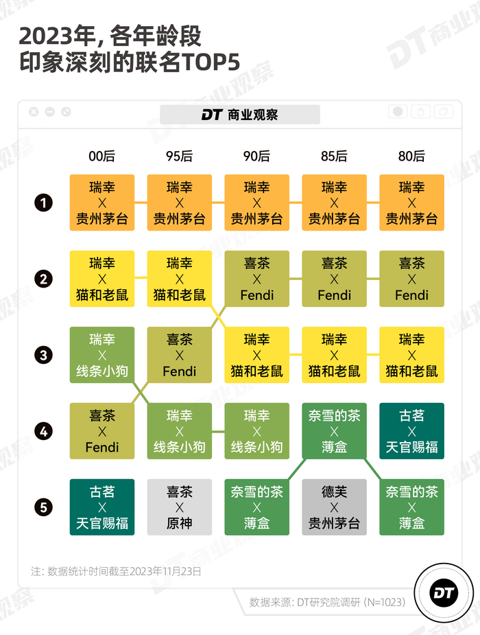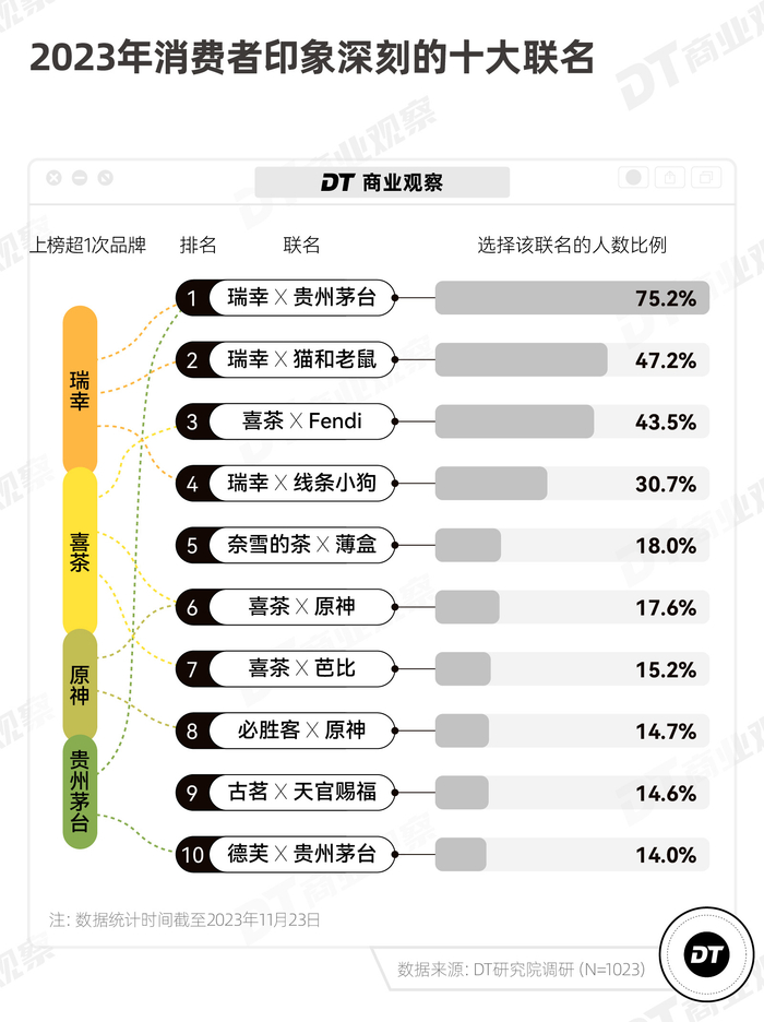 瑞幸和贵州茅台、瑞幸和《猫和老鼠》、喜茶和Fendi,成为2023年消费者印象最深刻的联名,得票率*其他联名。