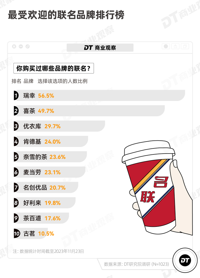 需要说明的是,由于问卷投放与报告发布之间存在时间差,包括喜茶和景德镇、库迪咖啡和《甄嬛传》在内的部分联名没有被统计在内。