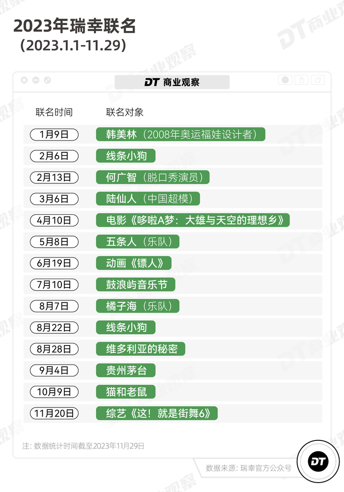 据《DT商业观察》的统计,截至11月28日,瑞幸今年已经推出14款联名产品,酱香拿铁可以说是瑞幸疯狂联名路上的一次成功试探。