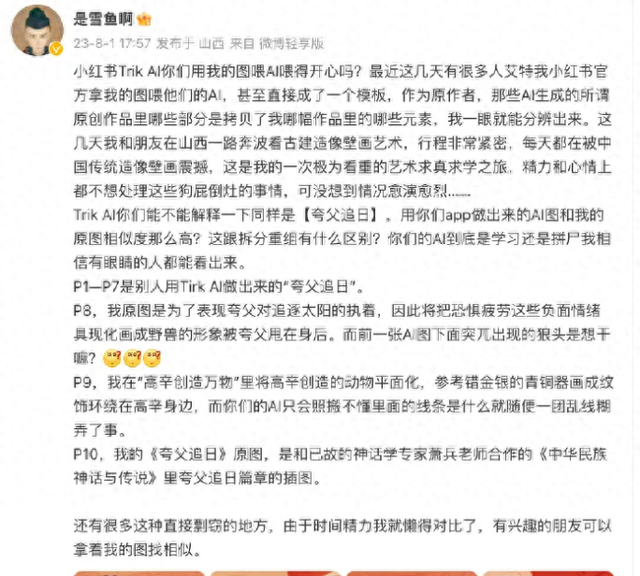 8月1日,插画师“是雪鱼啊”发现自己的插画“夸父追日”疑似被“喂”给了trik,trik生成的图片不管是色调还是整体构图、风格上都与“夸父追日”有相似之处,但是细节逻辑上有一些不合理的地方。“你们的AI到底是学习还是拼尸我相信有眼睛的人都能看出来。”在“是雪鱼啊”发声后,越来越多活跃在小红书上的插画师发现了类似的情况,插画师“正版青团子”在8月12日通过微博表态称自己被朋友告知自己的图被AI洗稿,看了后发现确实无论是配色元素还是画面风格都和自己的图很像,“希望大家能一起维权。”