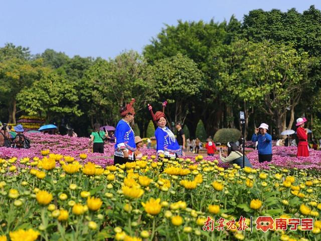 在青秀山风景区东盟友谊园,以“芳菊耀金秋,诗情满青山”为主题的第八届青秀山菊花展火热进行中,粉色系、红色系、黄色系、绿色系等色系的菊花竞相绽放,吸引众多市民游客慕名前来打卡拍照。