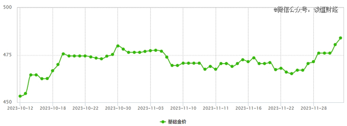 由于国际冲突升级,导致全球对避险资产的需求增加,金价自10月初有所下降后又猛烈走高。10月份至今,国内基础金价从440元/克涨到了480.5元/克,创年内新高。两个月的时间,国内基础金价涨幅近10%。