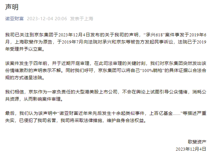 据诺亚财富微信公号,今日晚间,歌斐资产发表声明称,我司已关注到京东集团于2023年12月4日发布的关于我司的声明,“承兴618”案件事发于2019年6月,上海歌斐作为原告,于2019年7月向法院对承兴和京东等被告方发起民事诉讼,法院已于2019年受理并予以立案。