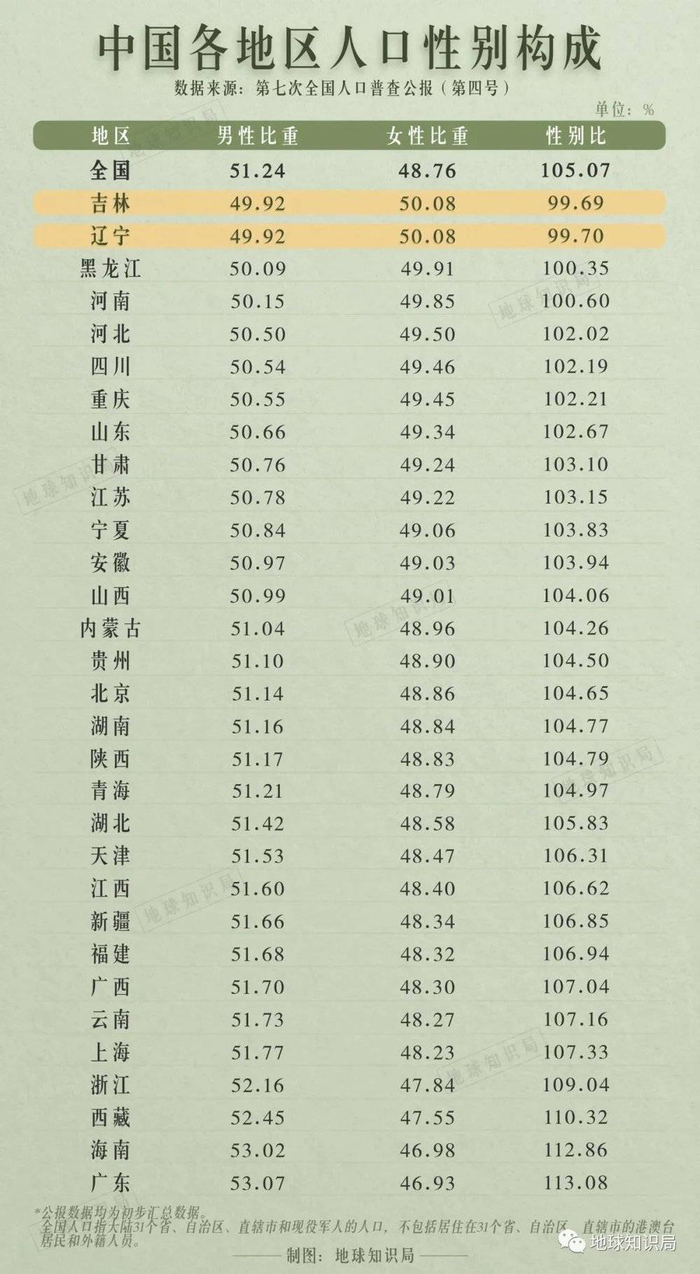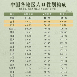 根据第七次全国人口普查统计,辽宁、吉林两省分别以99.70、99.69的性别比,成为了中国内地仅有的女多男少的省份。其它省份性别比均高于100,广东更是达到了全国最高的113.08,这意味着广东每有100名女性就有113名男性。