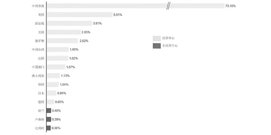 离岸人民币资金池高度集中于中国香港。相较之下,其他离岸人民币市场发展相对缓慢,且各个市场之间尚未建立有效联系,在一定程度上限制了人民币全球交易网络的拓展(图2)。