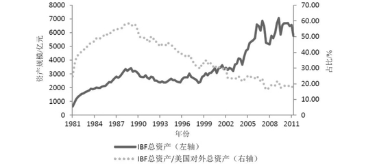 离岸美元市场的存在和发展为美元的第三方使用和境外循环创造了条件,进一步稳固了美元的国际地位,但同时也带来了一系列负面影响,如美元外流加速、税收收入减少、利率定价权转移、纽约国际金融中心地位弱化等。1981年12月,美联储批准设立国际银行设施(International Banking Facilities,IBF),允许美国银行以及外国银行在美国的分行和经理处从事离岸美元业务,首开货币发行国境内设立离岸市场经营本币的先河,实质是将离岸美元市场延伸至美国境内,便于本土金融机构直接参与离岸金融活动,加强与其他国际金融中心的竞争。1981—1989年,IBF总资产增长较快,但1990年以后,随着在岸、离岸市场加速融合,针对IBF的监管优惠越来越少,IBF总资产在10多年间基本处于停滞状态(图3)。这一变化趋势充分体现了IBF作为过渡性制度安排的特点,一旦金融市场开放达到相当程度,非居民可自由进出在岸市场,“在岸的离岸市场”势必失去原有的吸引力。